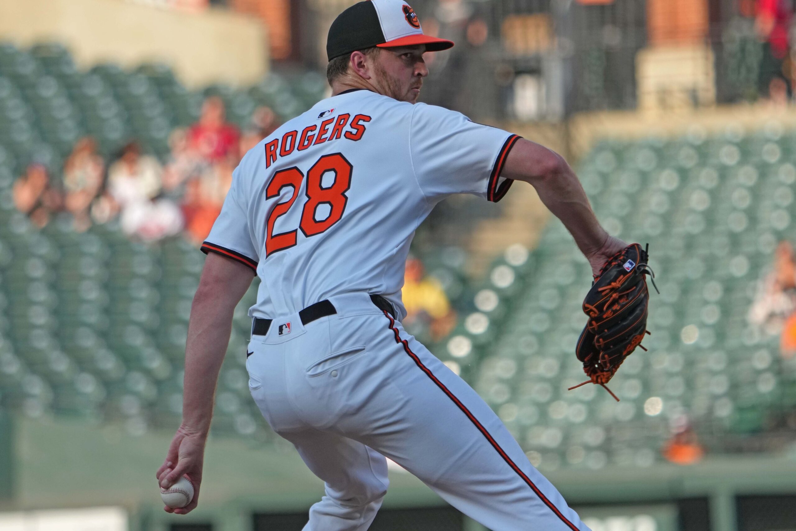 Jun 23, 2025; Baltimore, Maryland, USA; Baltimore Orioles pitcher Trevor Rogers (28) delivers in the first inning against the Texas Rangers at Oriole Park at Camden Yards. Mandatory Credit: Mitch Stringer-Imagn Images