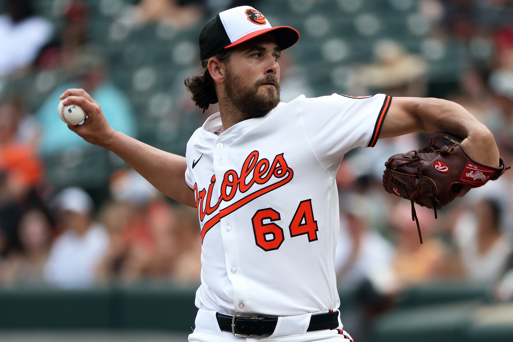 Jun 29, 2025; Baltimore, Maryland, USA; Baltimore Orioles pitcher Dean Kremer (64) throws during the first inning against the Tampa Bay Rays at Oriole Park at Camden Yards. Mandatory Credit: Daniel Kucin Jr.-Imagn Images