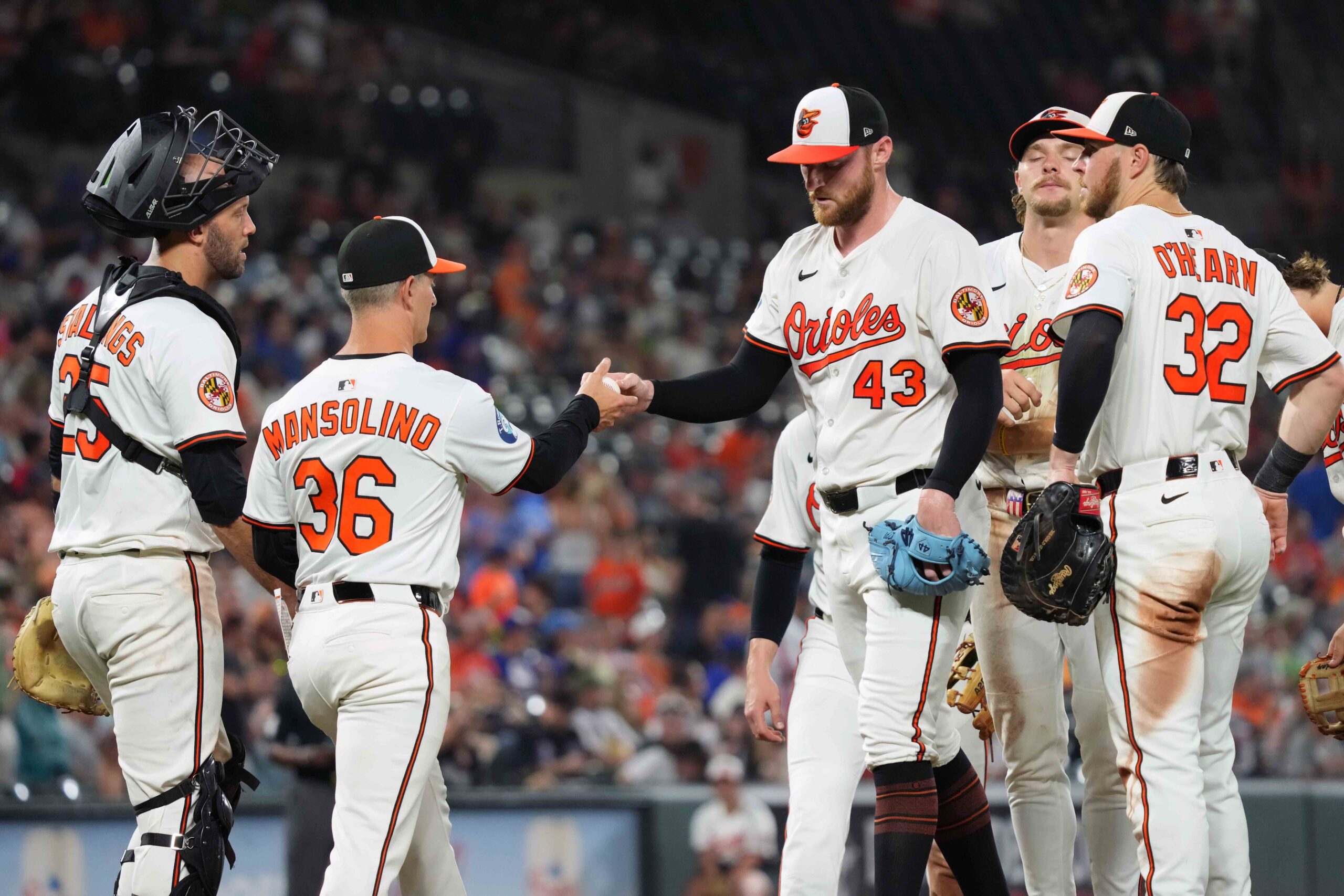 Jul 8, 2025; Baltimore, Maryland, USA; Baltimore Orioles interim manager Tony Mansolino (36) removes pitcher Bryan Baker (43) from the game during the eighth inning against the New York Mets at Oriole Park at Camden Yards. Mandatory