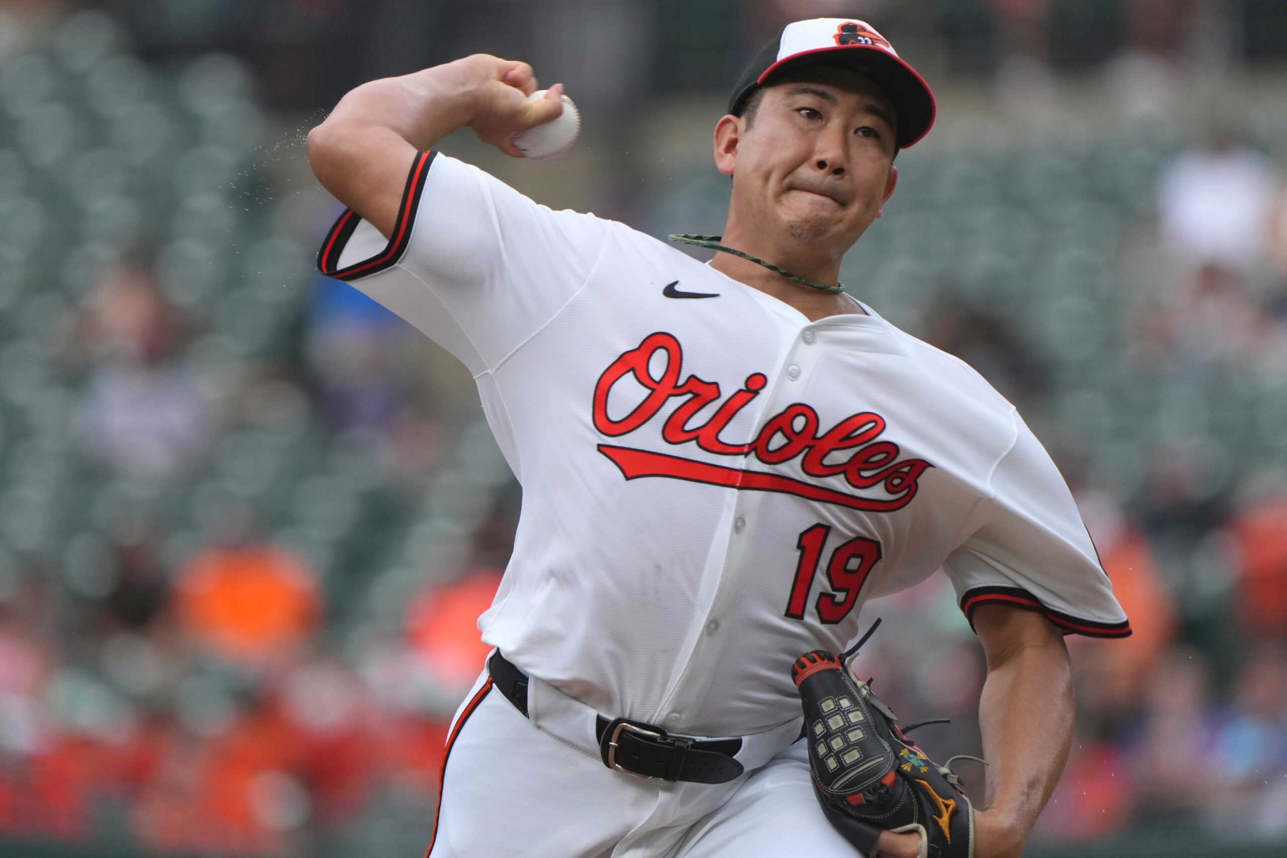 Jul 10, 2025; Baltimore, MD, USA; Baltimore Orioles pitcher Tomoyuki Sugana (19) delivers during the first inning against the New York Mets at Oriole Park at Camden Yards. Mandatory Credit: Mitch Stringer-Imagn Images