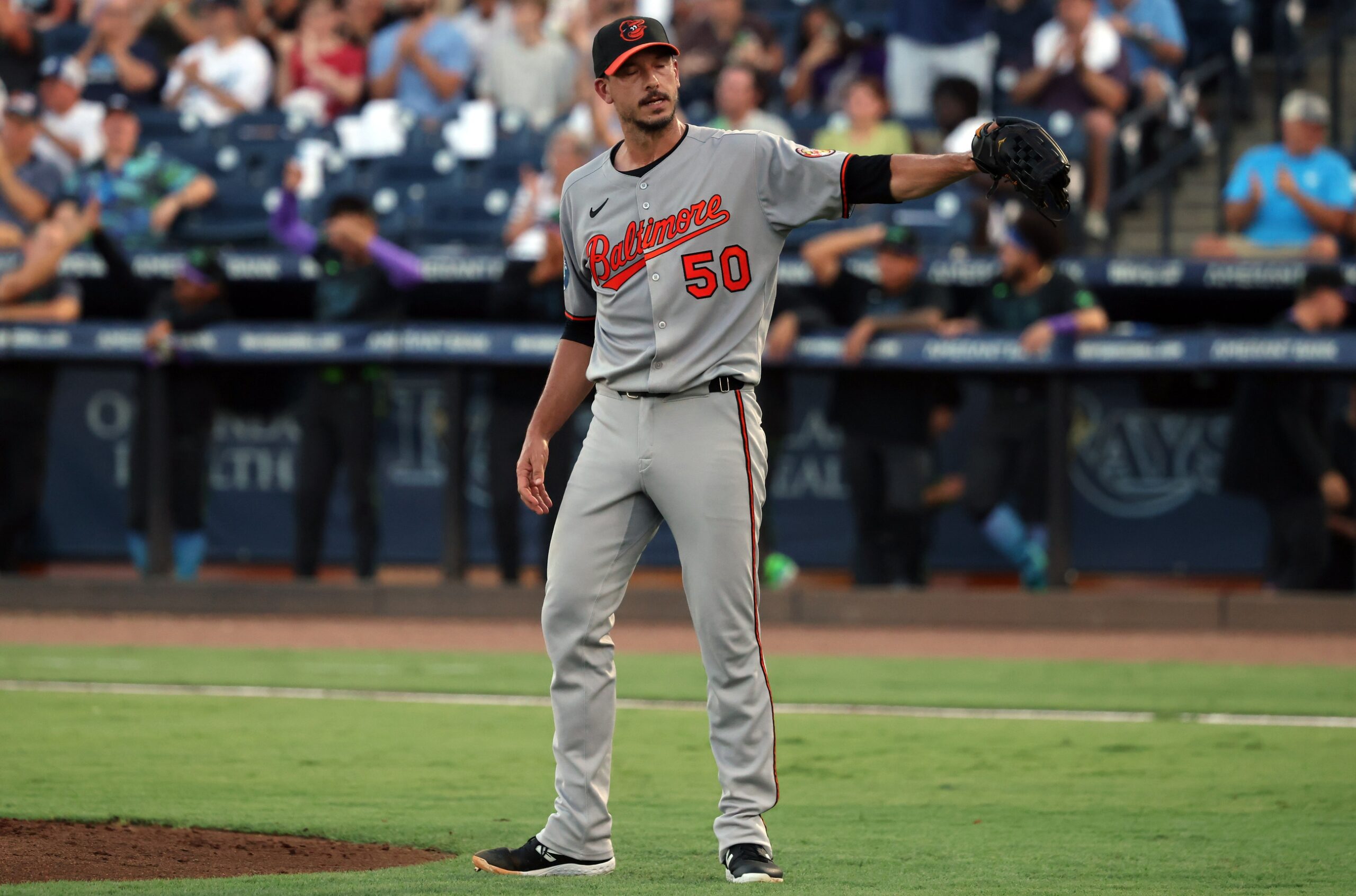 Jul 21, 2025; St. Petersburg, Florida, USA; Baltimore Orioles pitcher Charlie Morton (50) reacts after he gave up a home run during the second inning against the Tampa Bay Rays at George M. Steinbrenner Field. Mandatory Credit: Kim Klement Neitzel-Imagn Images