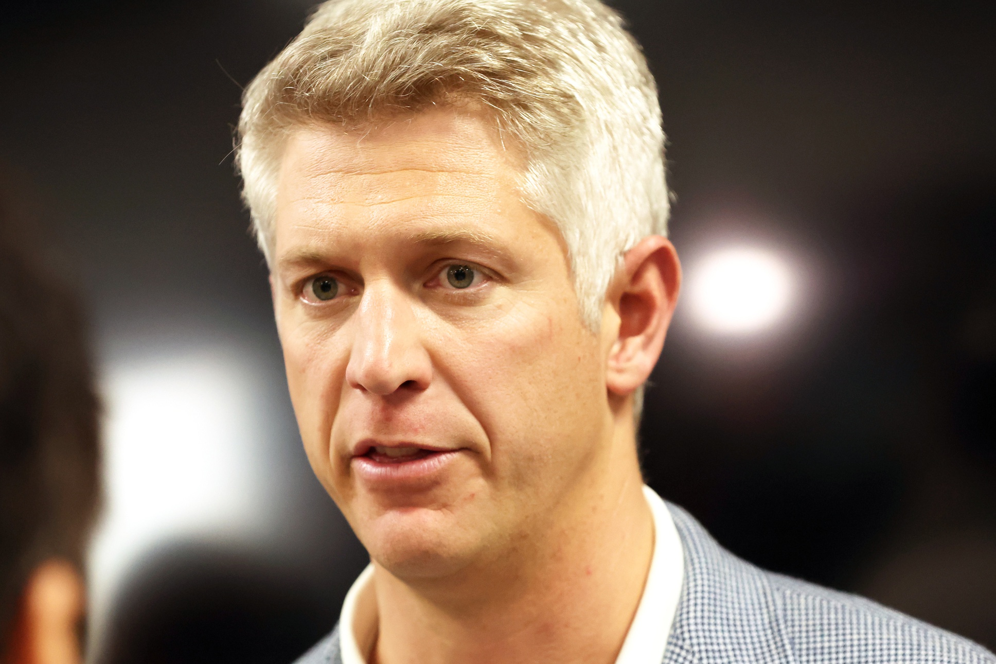 Feb 15, 2024; Tampa, FL, USA; Baltimore Orioles general manager Mike Elias talks with media at George M. Steinbrenner Field. Mandatory Credit: Kim Klement Neitzel-USA TODAY Sports