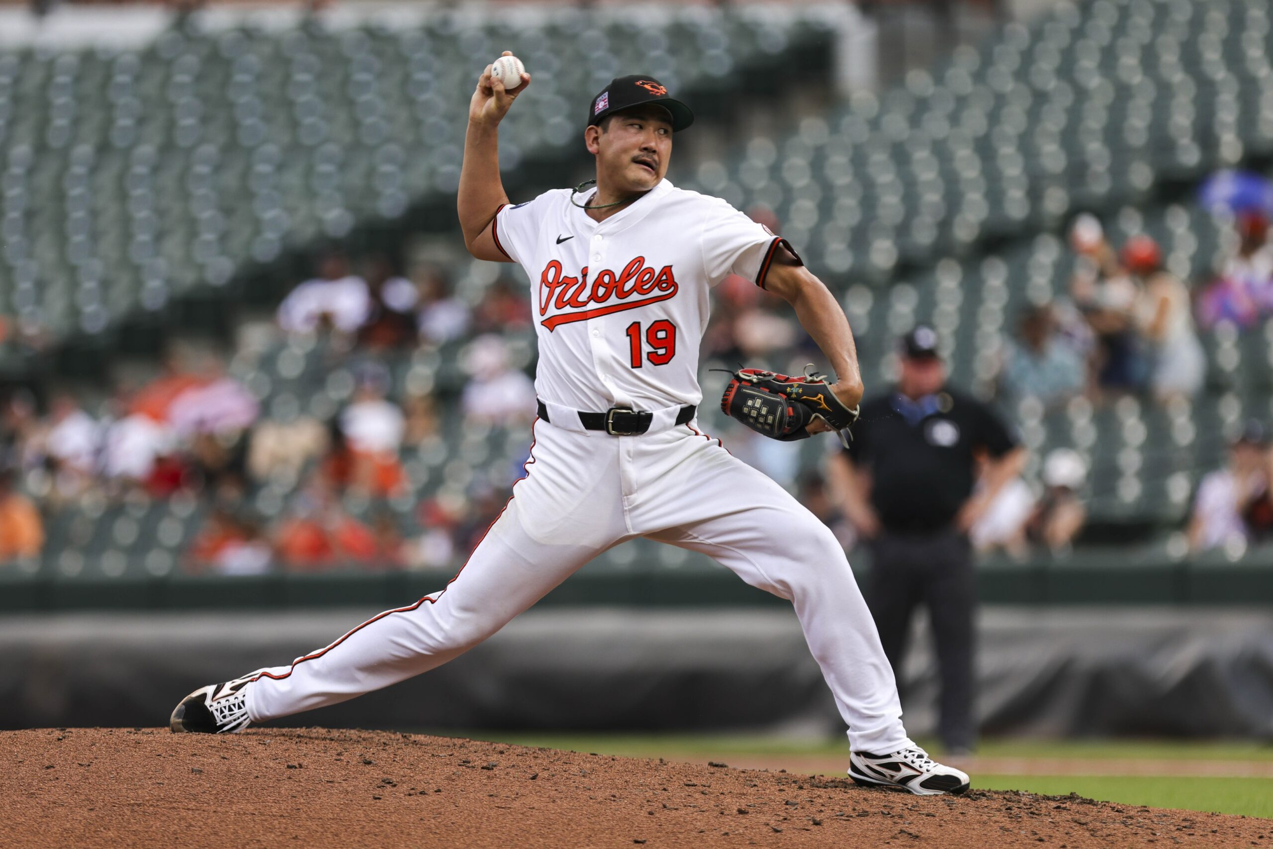 Jul 27, 2025; Baltimore, Maryland, USA; Baltimore Orioles’ pitcher Tomoyuki Sugano pitching against the Colorado Rockies in the third inning at Oriole Park at Camden Yards. Mandatory Credit: Lexi Thompson-Imagn Images