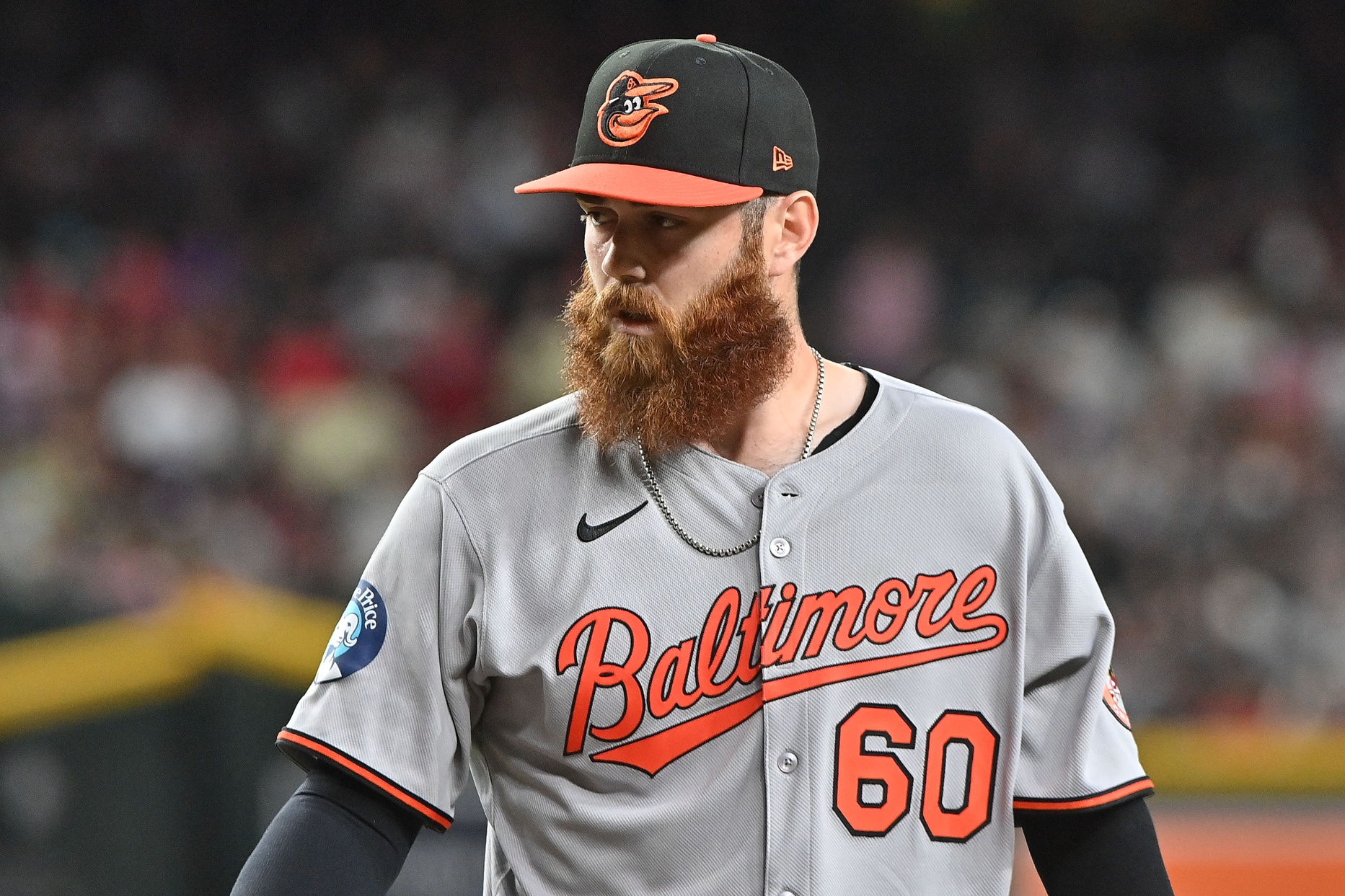 Apr 9, 2025; Phoenix, Arizona, USA; Baltimore Orioles pitcher Colin Selby (60) looks on in the eighth inning against the Arizona Diamondbacks at Chase Field. Mandatory Credit: Matt Kartozian-Imagn Images