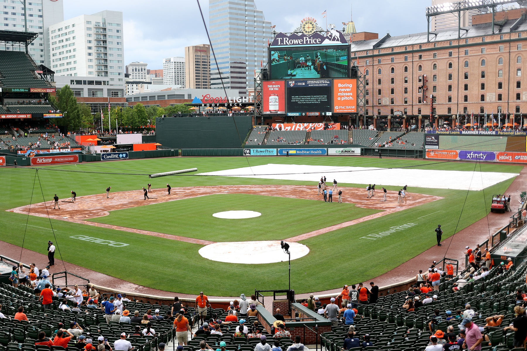 Aug 14, 2025; Baltimore, Maryland, USA; A rain delay commences during a game between the Seattle Mariners and the Baltimore Orioles at Oriole Park at Camden Yards. Mandatory Credit: Daniel Kucin Jr.-Imagn Images
