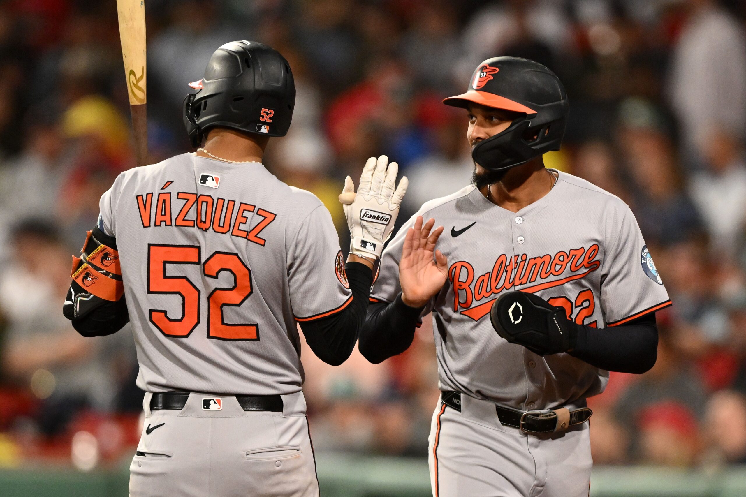 Aug 19, 2025; Boston, Massachusetts, USA; Baltimore Orioles second baseman Jeremiah Jackson (82) high-fives shortstop Luis Vazquez (52) after scoring a run against the Boston Red Sox during the eleventh inning at Fenway Park. Mandatory Credit: Brian Fluharty-Imagn Images
