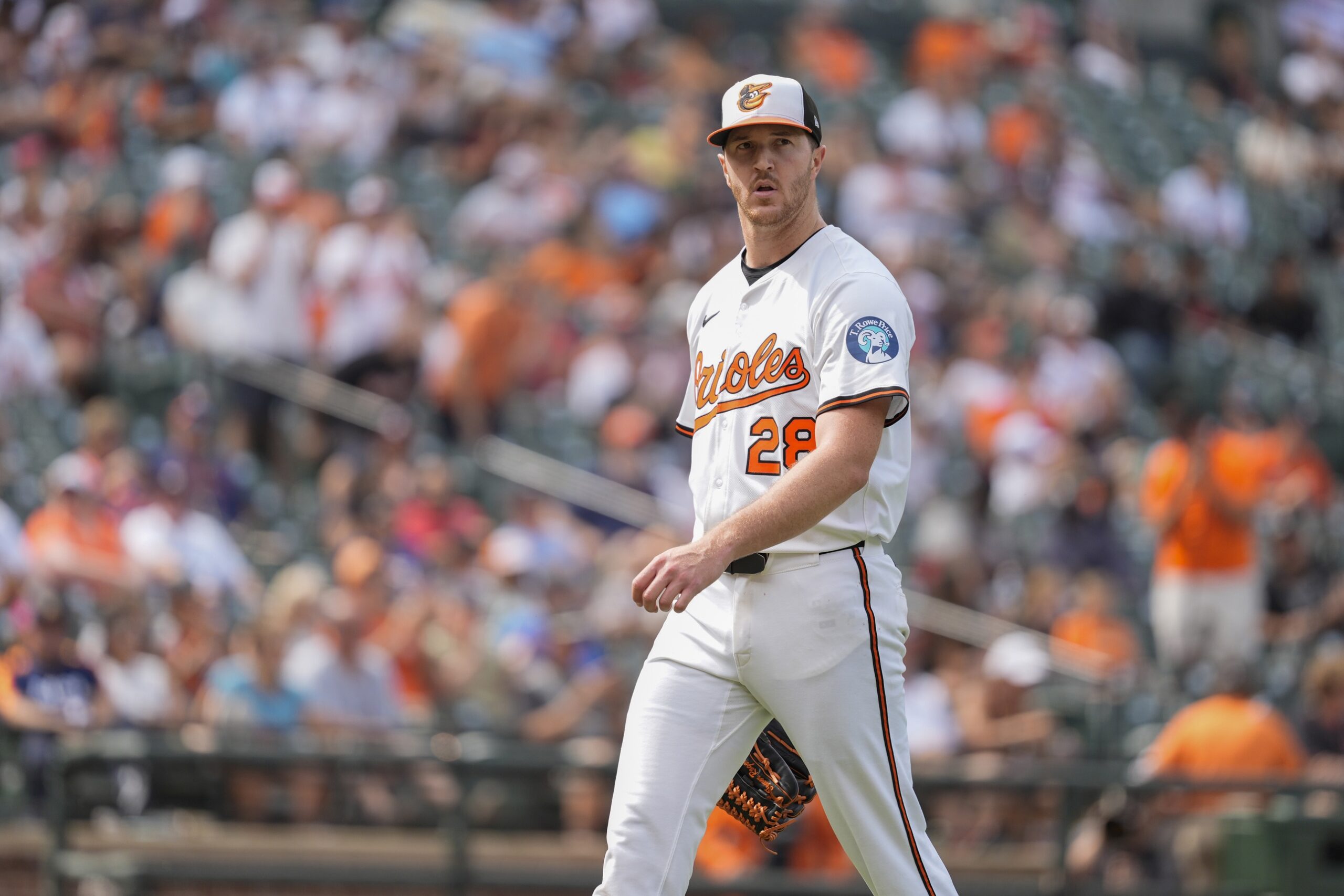 Aug 24, 2025; Baltimore, Maryland, USA; Baltimore Orioles pitcher Trevor Rogers (28) walks to the dugout in the middle of the seventh inning against the Houston Astros at Oriole Park at Camden Yards. Mandatory Credit: Gregory Fisher-Imagn Images