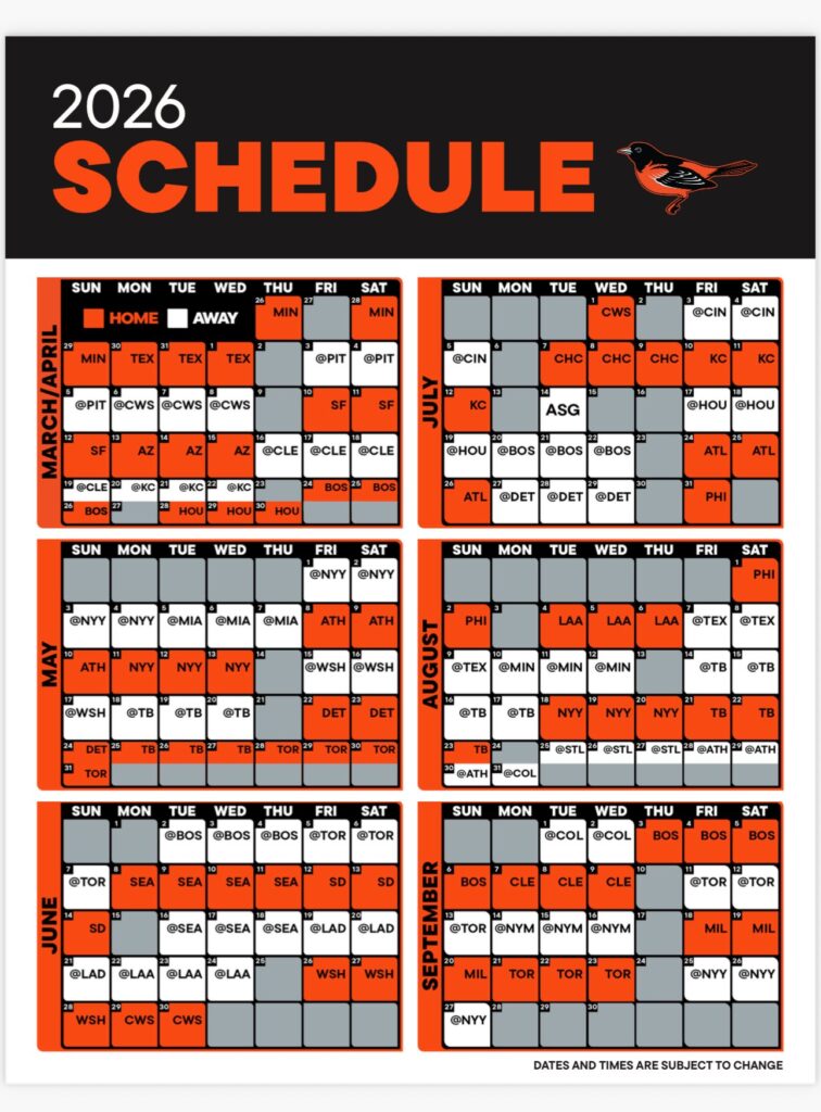 The Orioles will open the 2026 schedule at home with a six-game homestand. Opening Day will be on Thursday March 26th against the Minnesota Twins. After an open day on Friday and two more games against the Twins, the Orioles will play three games against Texas.