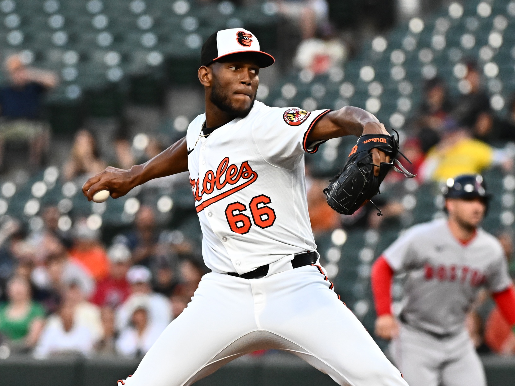 Aug 27, 2025; Baltimore, Maryland, USA; Baltimore Orioles pitcher Roansy Contreras (66) delivers a pitch during the third inning against the Boston Red Sox at Oriole Park at Camden Yards. Mandatory Credit: James A. Pittman-Imagn Images