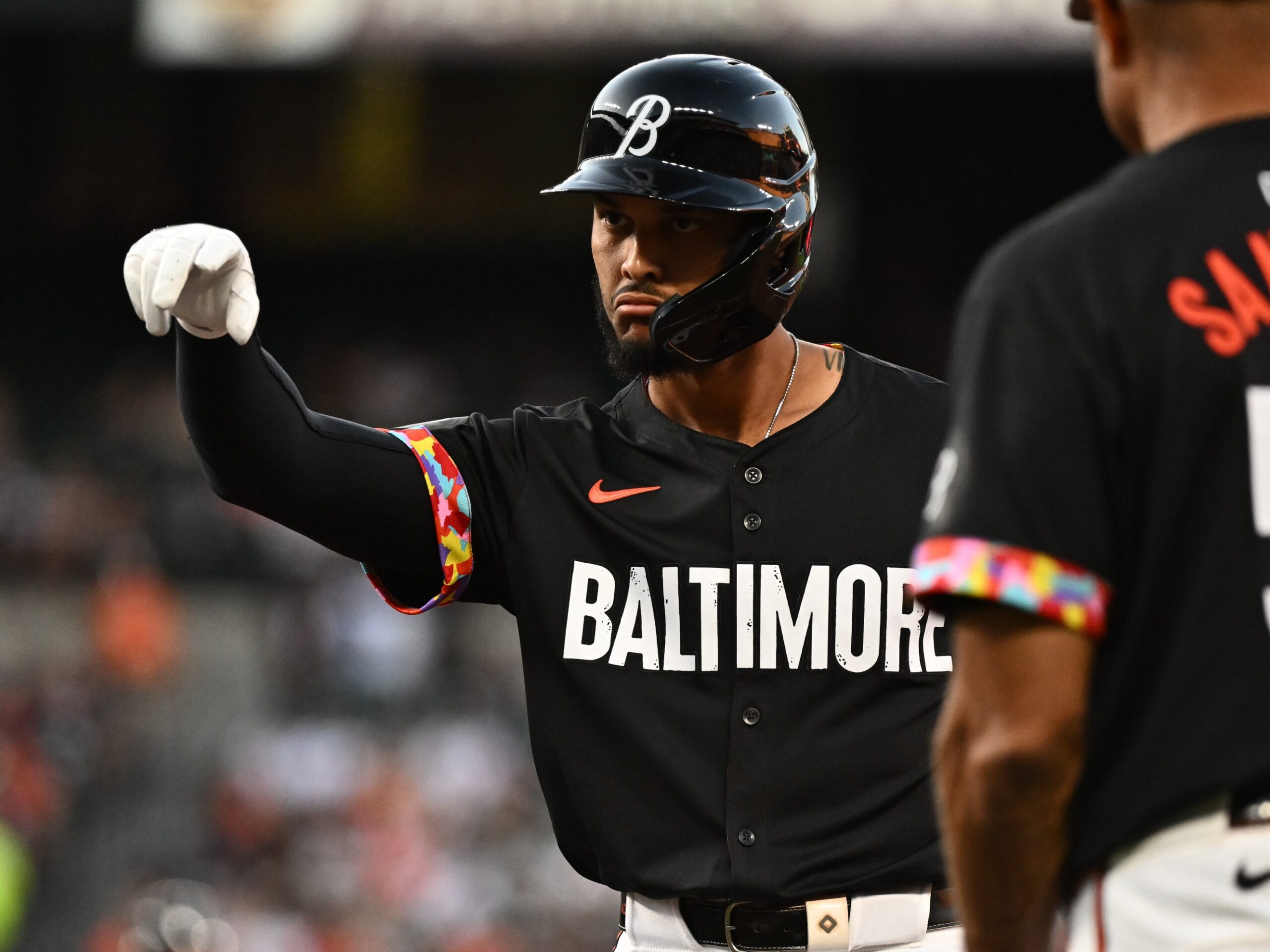 Aug 22, 2025; Baltimore, Maryland, USA; Baltimore Orioles outfielder Jeremiah Jackson (82) gestures towards the dugout during the first inning against the Houston Astros at Oriole Park at Camden Yards. Mandatory Credit: James A. Pittman-Imagn Images