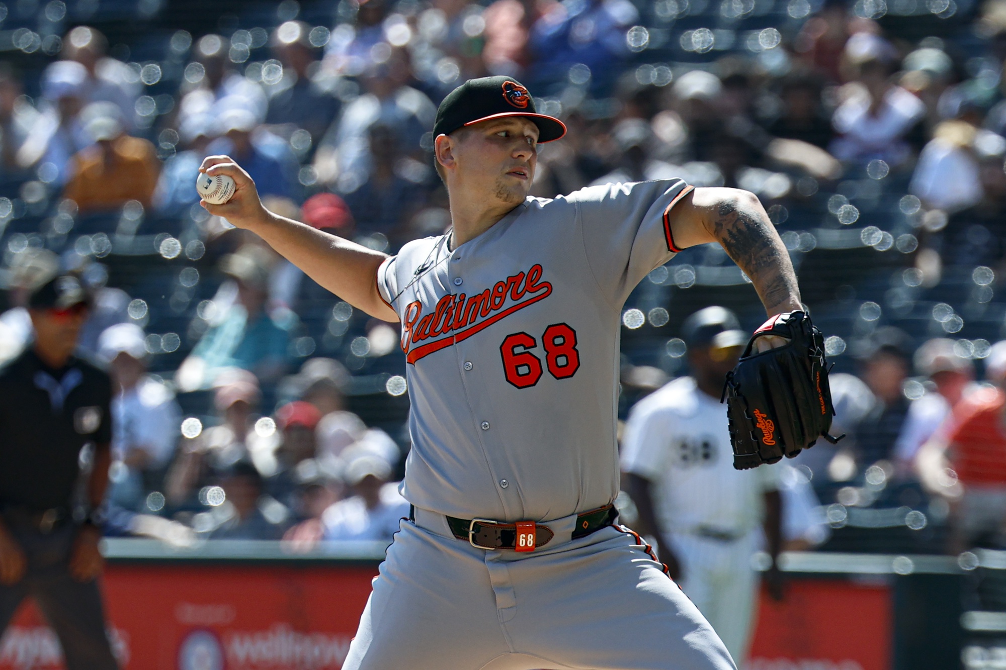 Sep 17, 2025; Chicago, Illinois, USA; Baltimore Orioles starting pitcher Tyler Wells (68) delivers a pitch against the Chicago White Sox during the first inning at Rate Field. Mandatory Credit: Kamil Krzaczynski-Imagn Images