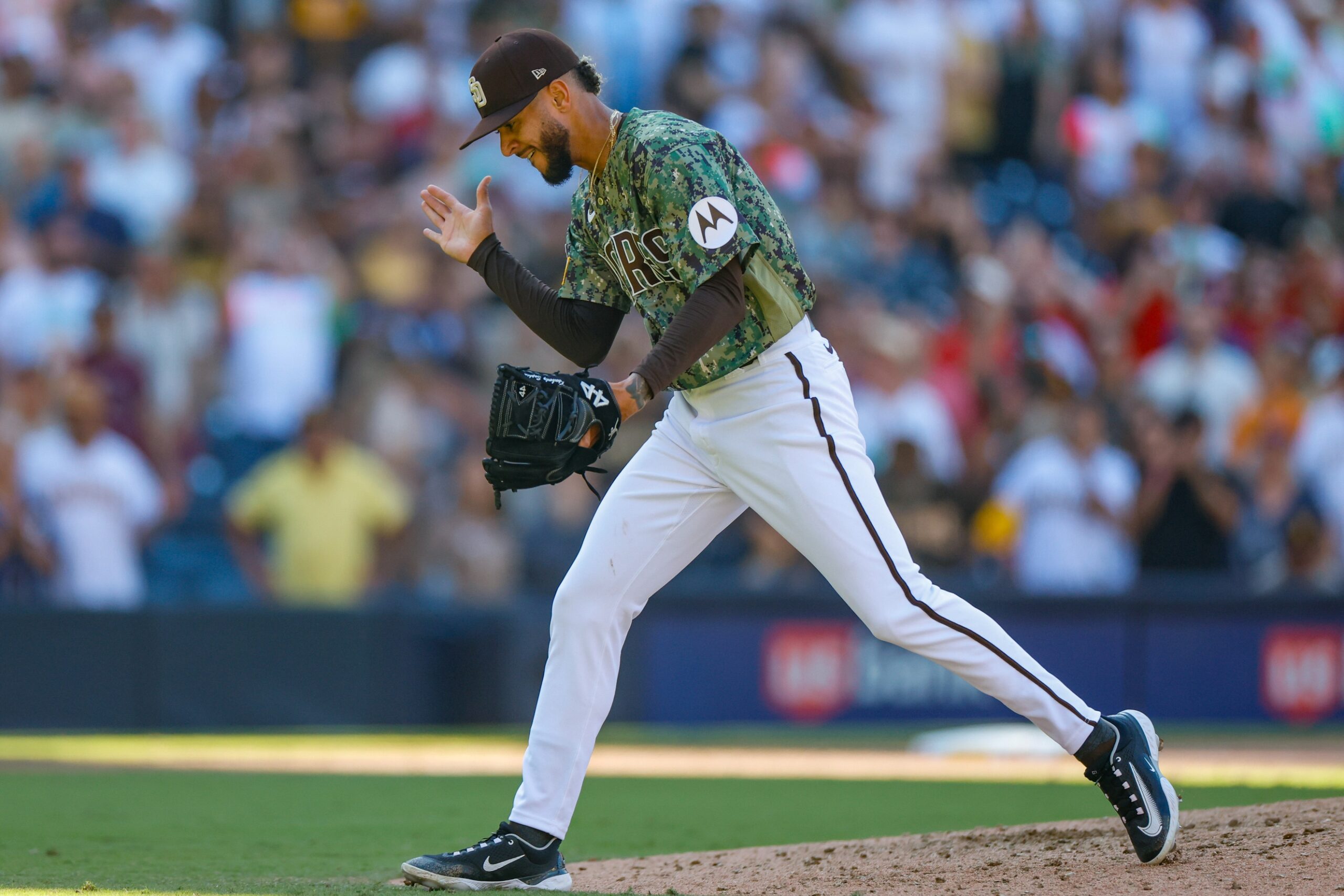 Sep 24, 2023; San Diego, California, USA; San Diego Padres relief pitcher Jose Espada(40) reacts after the final out of the ninth inning against the St. Louis Cardinals at Petco Park. Mandatory Credit: David Frerker-USA TODAY Sports