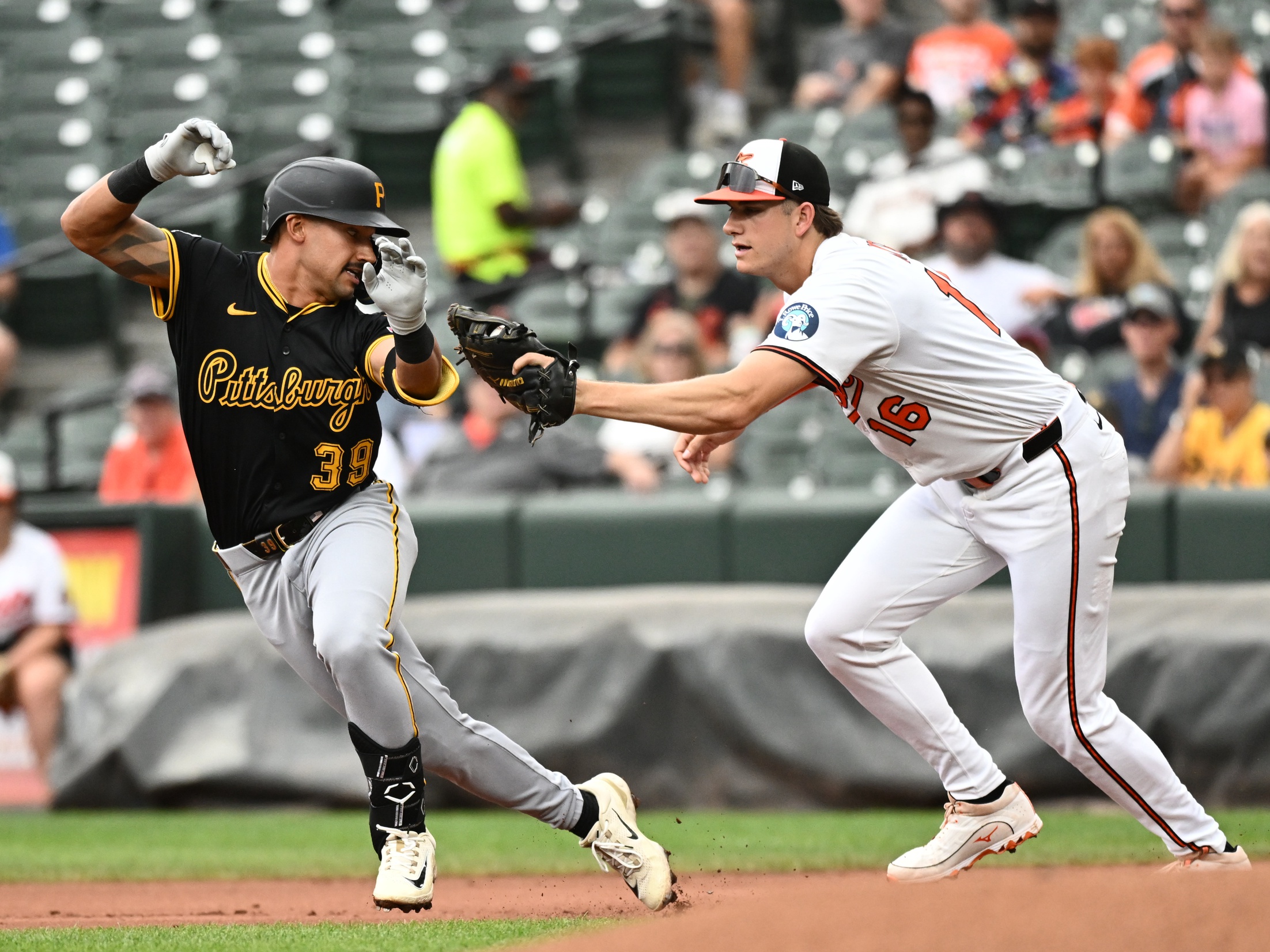 Sep 11, 2025; Baltimore, Maryland, USA; Pittsburgh Pirates second baseman Nick Gonzales (39) attempts to avoid the tag by Baltimore Orioles first baseman Coby Mayo (16) during the first inning at Oriole Park at Camden Yards. Mandatory Credit: James A. Pittman-Imagn Images