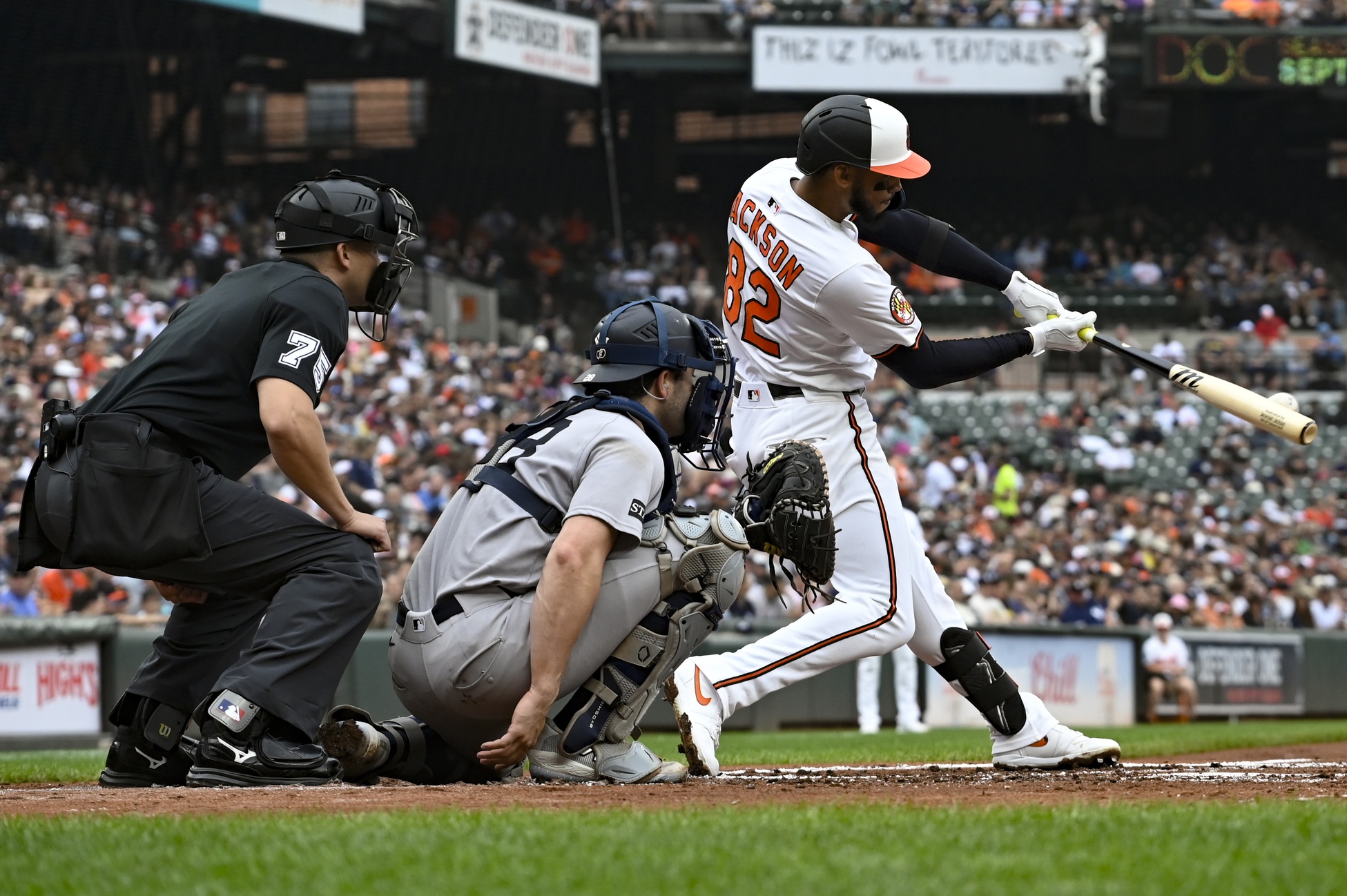 Sep 21, 2025; Baltimore, Maryland, USA; Baltimore Orioles third base Jeremiah Jackson (82) hits a second inning double against the New York Yankees at Oriole Park at Camden Yards. Mandatory Credit: Tommy Gilligan-Imagn Images