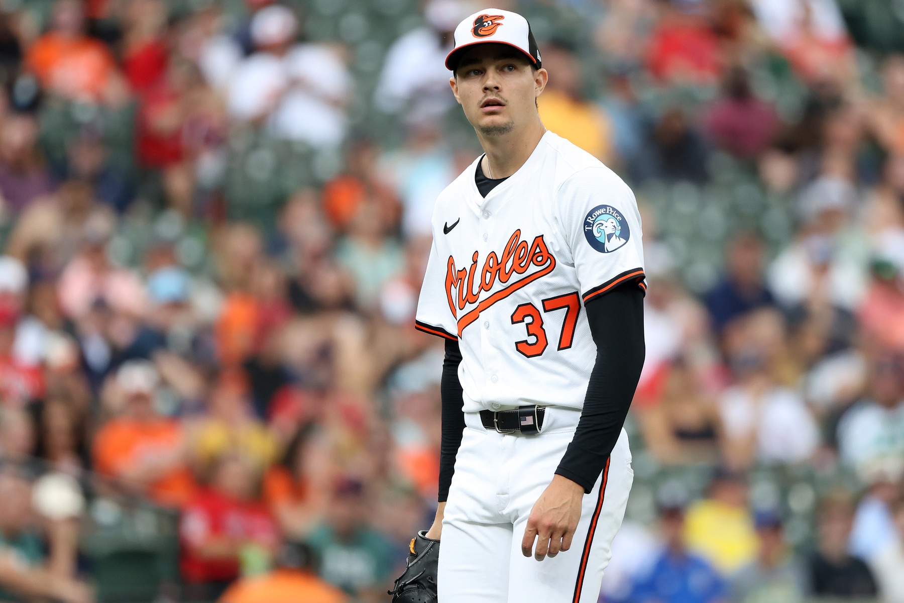 Aug 28, 2025; Baltimore, Maryland, USA; Baltimore Orioles pitcher Cade Povich (37) looks on during the first inning against the Boston Red Sox at Oriole Park at Camden Yards. Mandatory Credit: Daniel Kucin Jr.-Imagn Images