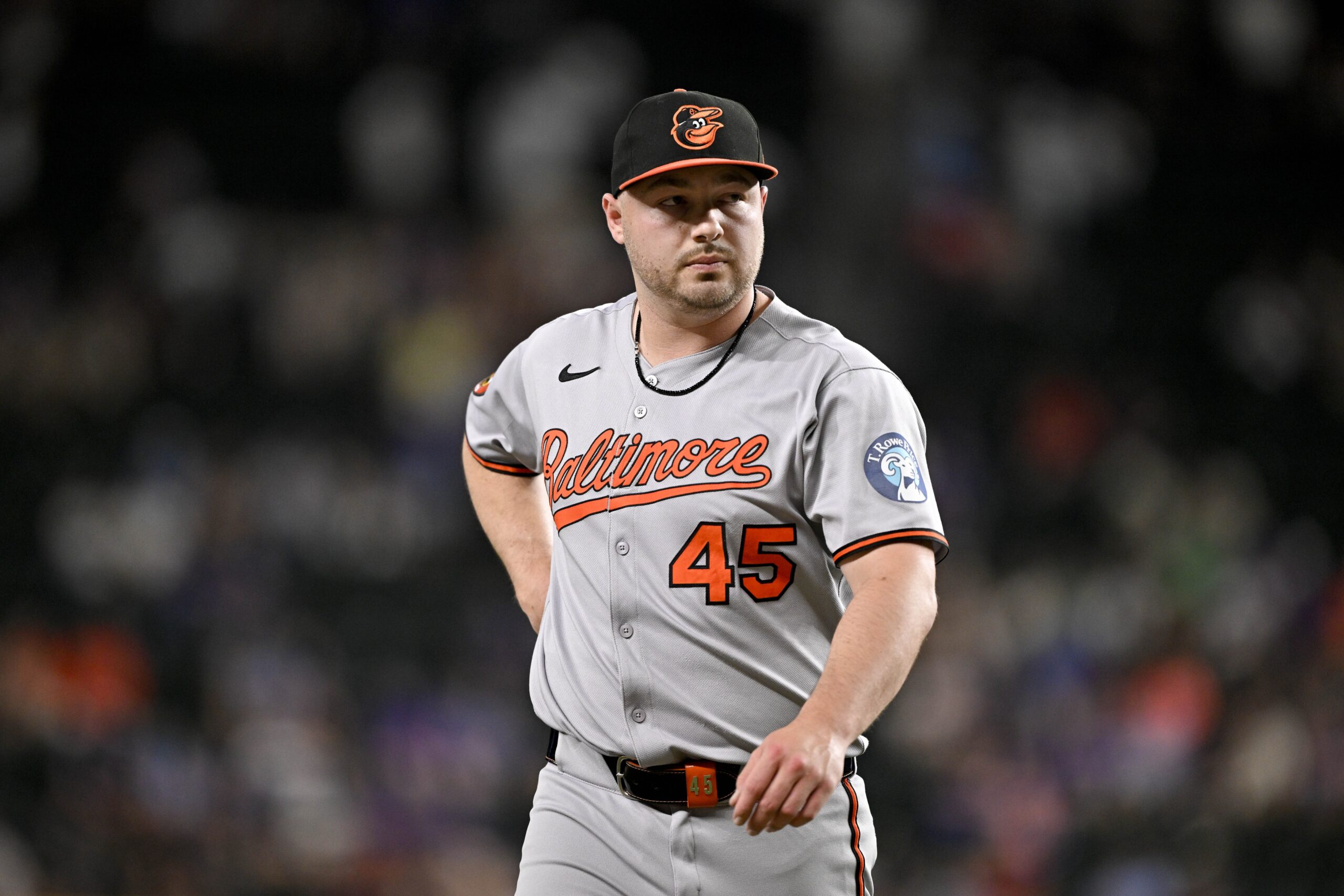 Jun 30, 2025; Arlington, Texas, USA; Baltimore Orioles relief pitcher Keegan Akin (45) comes off the field after he pitches against the Texas Rangers during the tenth inning at Globe Life Field. Mandatory Credit: Jerome Miron-Imagn Images