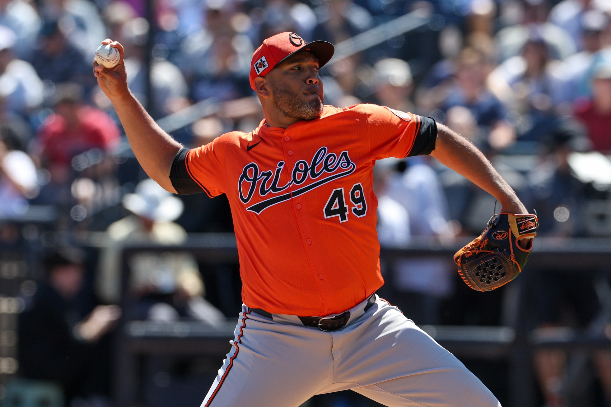 Mar 11, 2025; Tampa, Florida, USA; Baltimore Orioles pitcher Albert Suarez (49) throws a pitch against the New York Yankees in the second inning during spring training at George M. Steinbrenner Field. Mandatory Credit: Nathan Ray Seebeck-Imagn Images