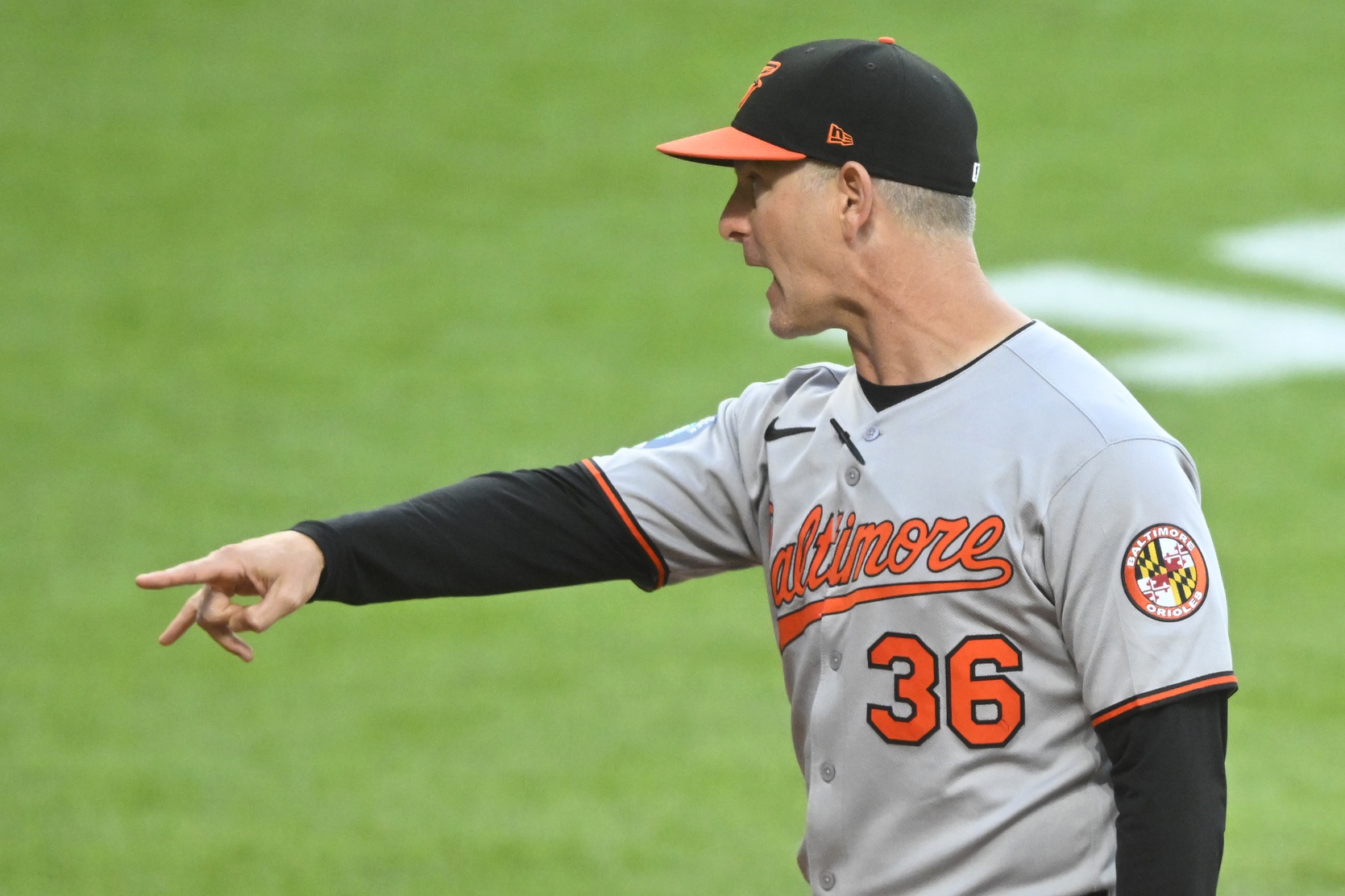 Jul 22, 2025; Cleveland, Ohio, USA; Baltimore Orioles interim manager Tony Mansolino (36) reacts in the fifth inning against the Cleveland Guardians at Progressive Field. Mandatory Credit: David Richard-Imagn Images
