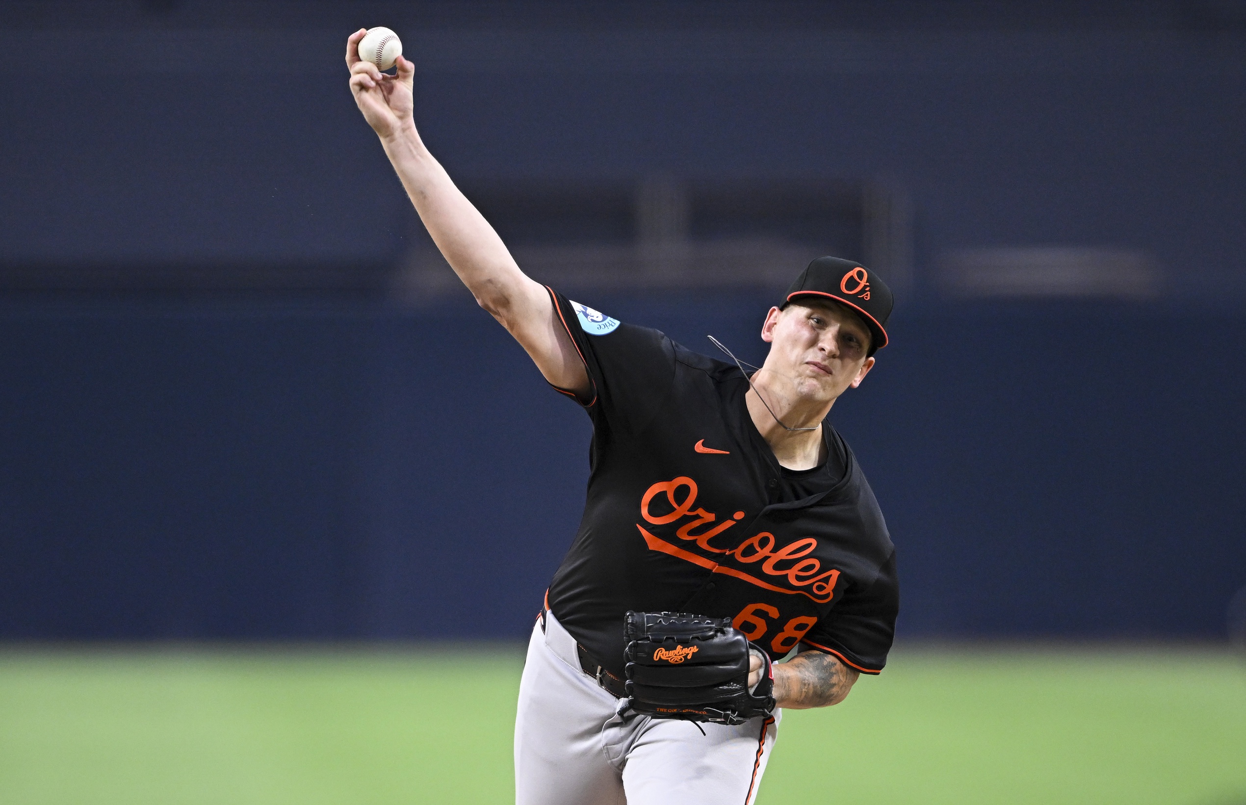Sep 2, 2025; San Diego, California, USA; Baltimore Orioles Tyler Wells (68) delivers during the first inning against the San Diego Padres at Petco Park. Mandatory Credit: Denis Poroy-Imagn Images