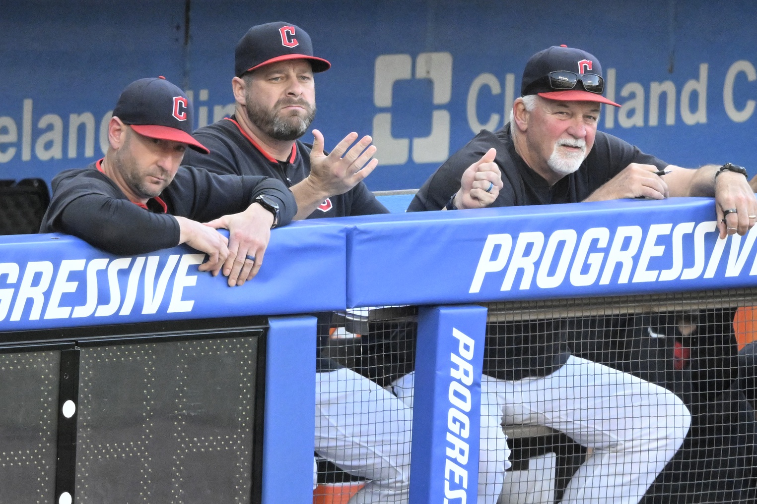 Jul 22, 2025; Cleveland, Ohio, USA; Cleveland Guardians associate manager Craig Albernaz (left), manager Stephen Vogt (center) and pitching coach Carl Willis (51) react after a foul ball entered the dugout in the third inning against the Baltimore Orioles at Progressive Field. Mandatory Credit: David Richard-Imagn Images