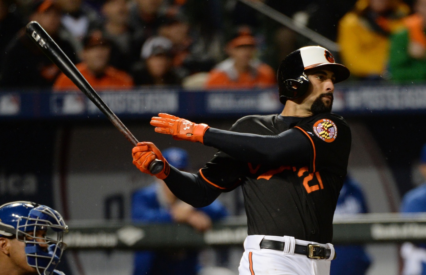 Oct 10, 2014; Baltimore, MD, USA; Baltimore Orioles right fielder Nick Markakis (21) hits a double in the sixth inning against the Kansas City Royals in game one of the 2014 ALCS playoff at Oriole Park at Camden Yards. Mandatory Credit: H. Darr Beiser-USA TODAY Sports