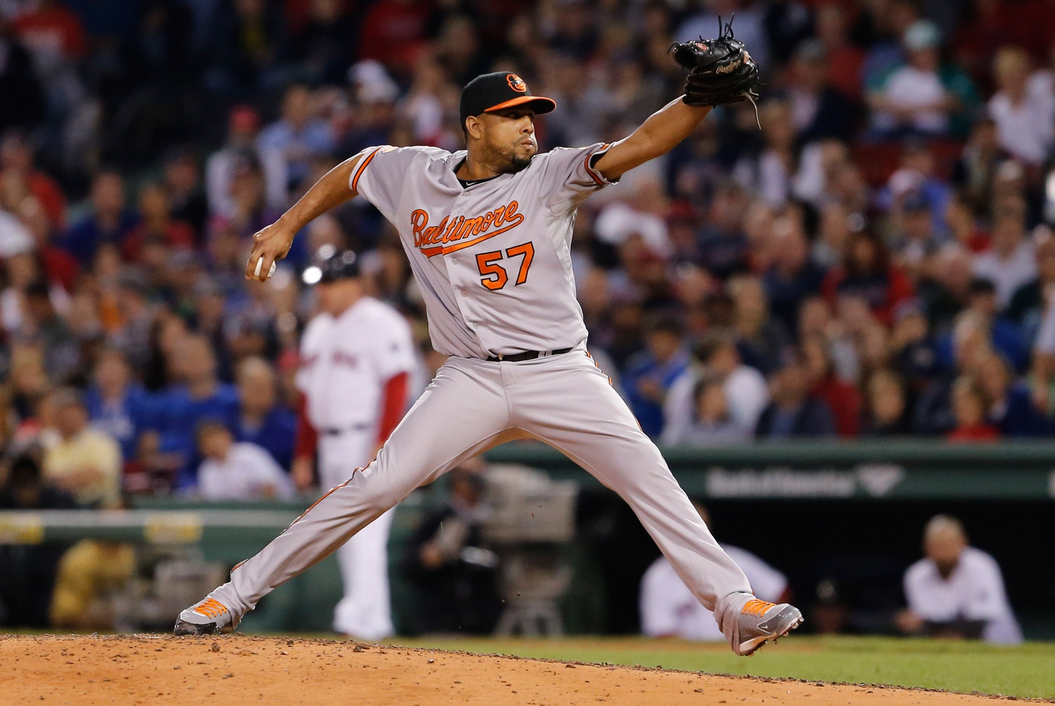 Sep 18, 2013; Boston, MA, USA; Baltimore Orioles relief pitcher Francisco Rodriguez (57) throws a pitch against the Boston Red Sox in the sixth inning at Fenway Park. Mandatory Credit: David Butler II-USA TODAY Sports
