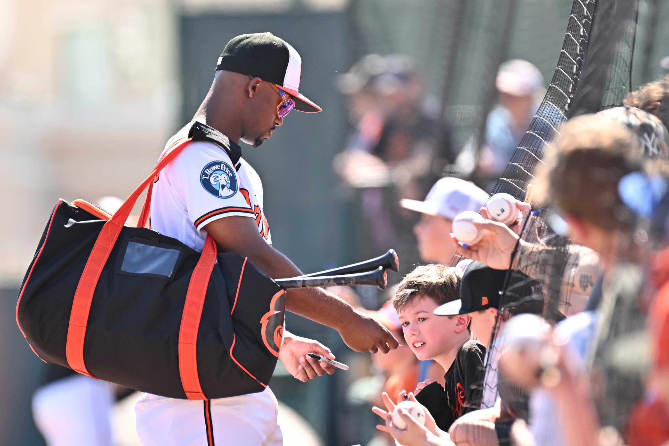 Feb 20, 2026; Sarasota, Florida, USA; Baltimore Orioles outfielder Enrique Bradfield Jr. (72) signs autographs before the start of the spring training game against the New York Yankees at Ed Smith Stadium. Mandatory Credit: Jonathan Dyer-Imagn Images