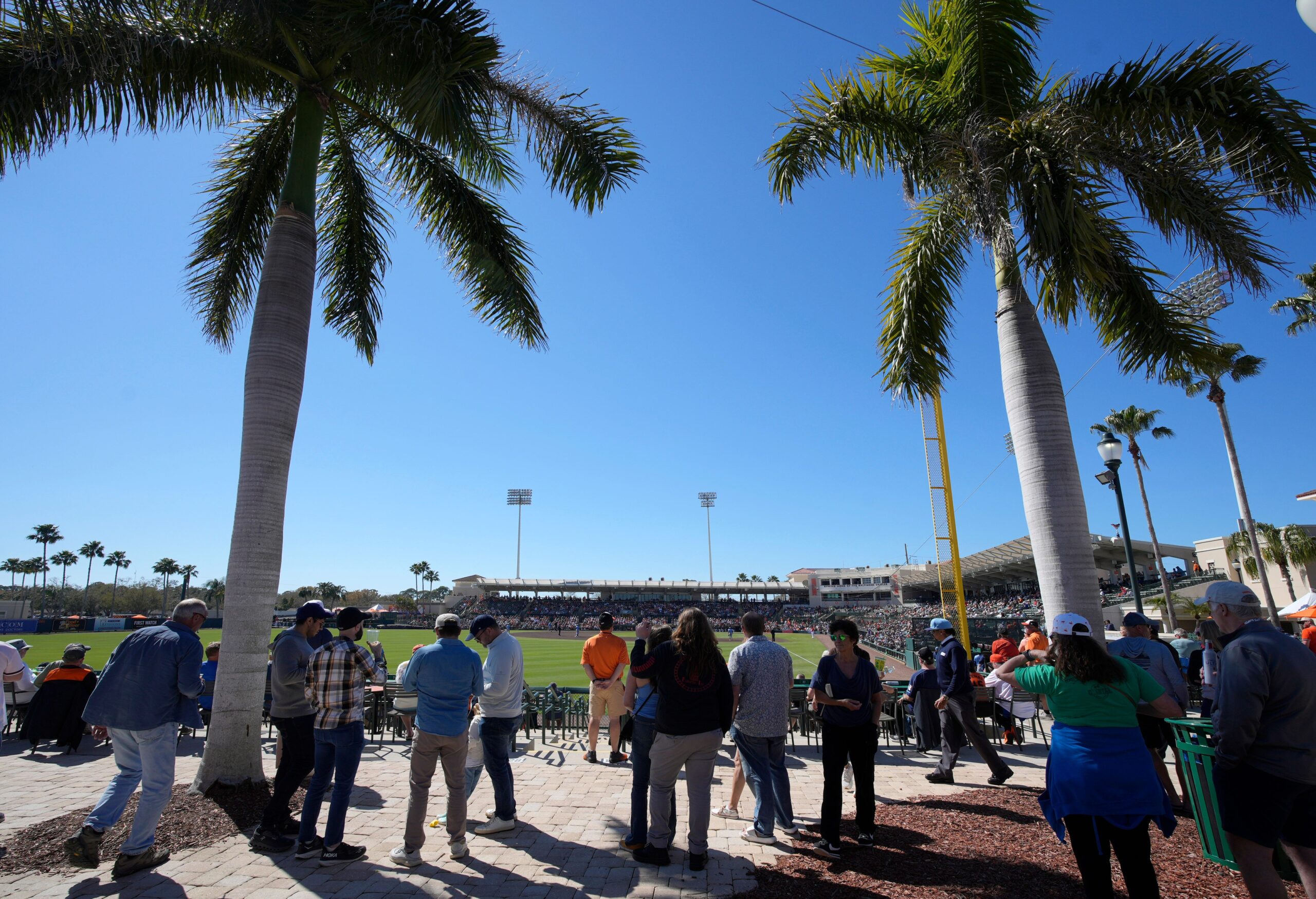 Fans hang out under palm trees at the Left Field Pavillion. The Baltimore Orioles hosted the Tampa Bay Rays in a Grapefruit League spring training game at Ed Smith Stadium in Sarasota on Wednesday, Feb. 25, 2026.