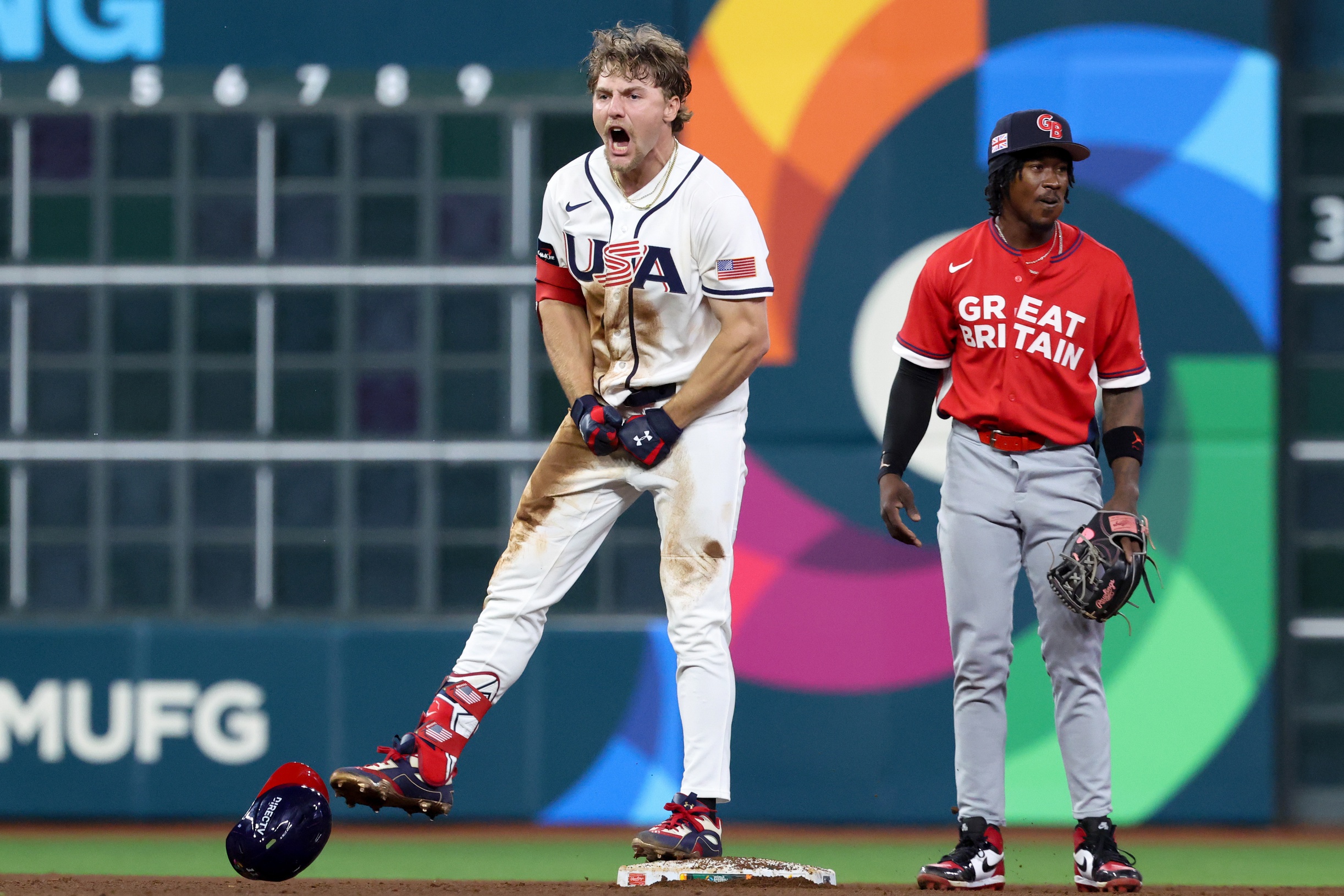 Mar 7, 2026; Houston, TX, United States; United States shortstop Gunnar Henderson (11) celebrates after hitting a two-run double against Great Britain during the fifth inning at Daikin Park. Mandatory Credit: Troy Taormina-Imagn Images