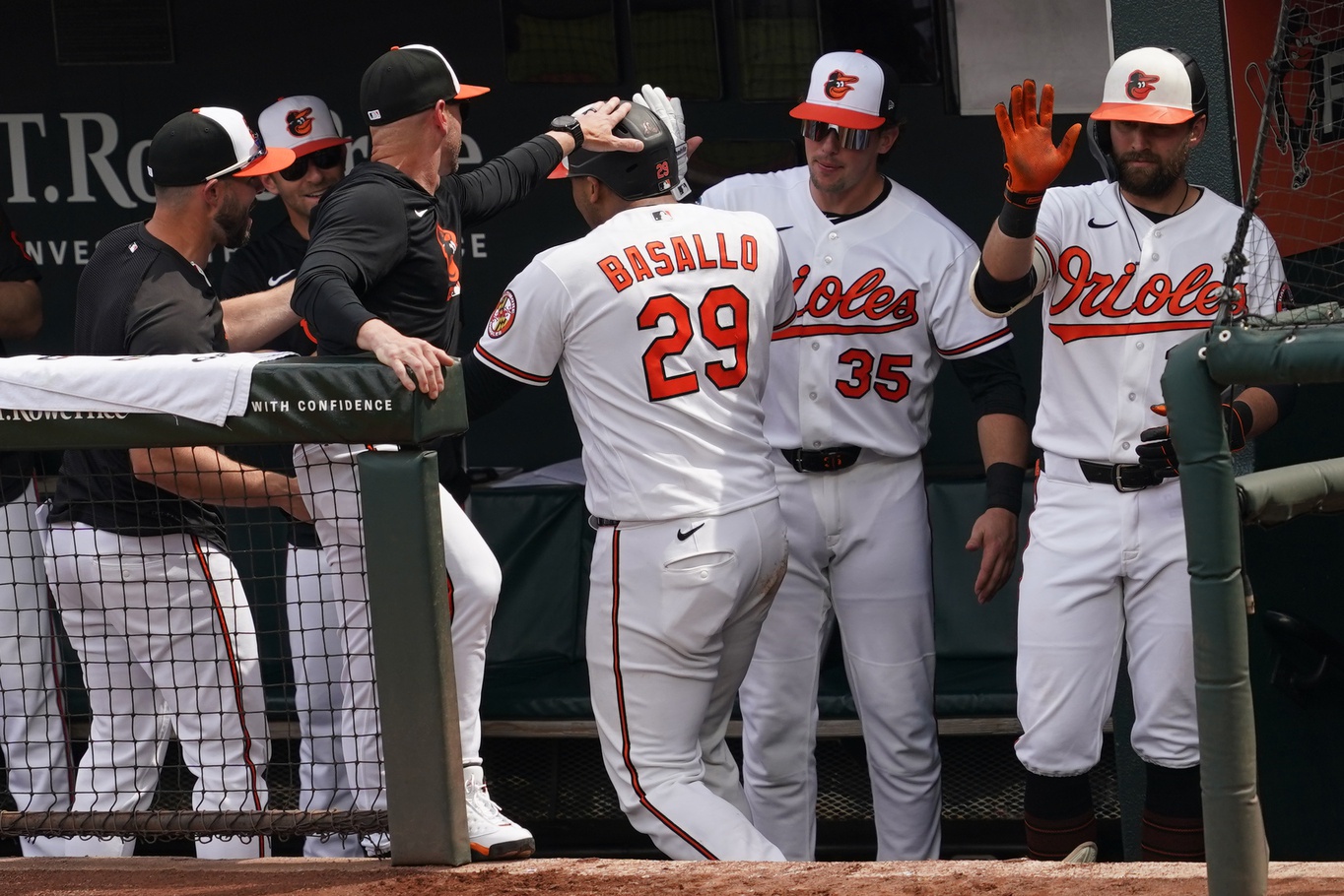 Apr 1, 2026; Baltimore, Maryland, USA; Baltimore Orioles catcher Samuel Basillo (29) greeted by teammates following his solo home run during the fifth inning against the Texas Rangers at Oriole Park at Camden Yards. Mandatory Credit: Mitch Stringer-Imagn Images