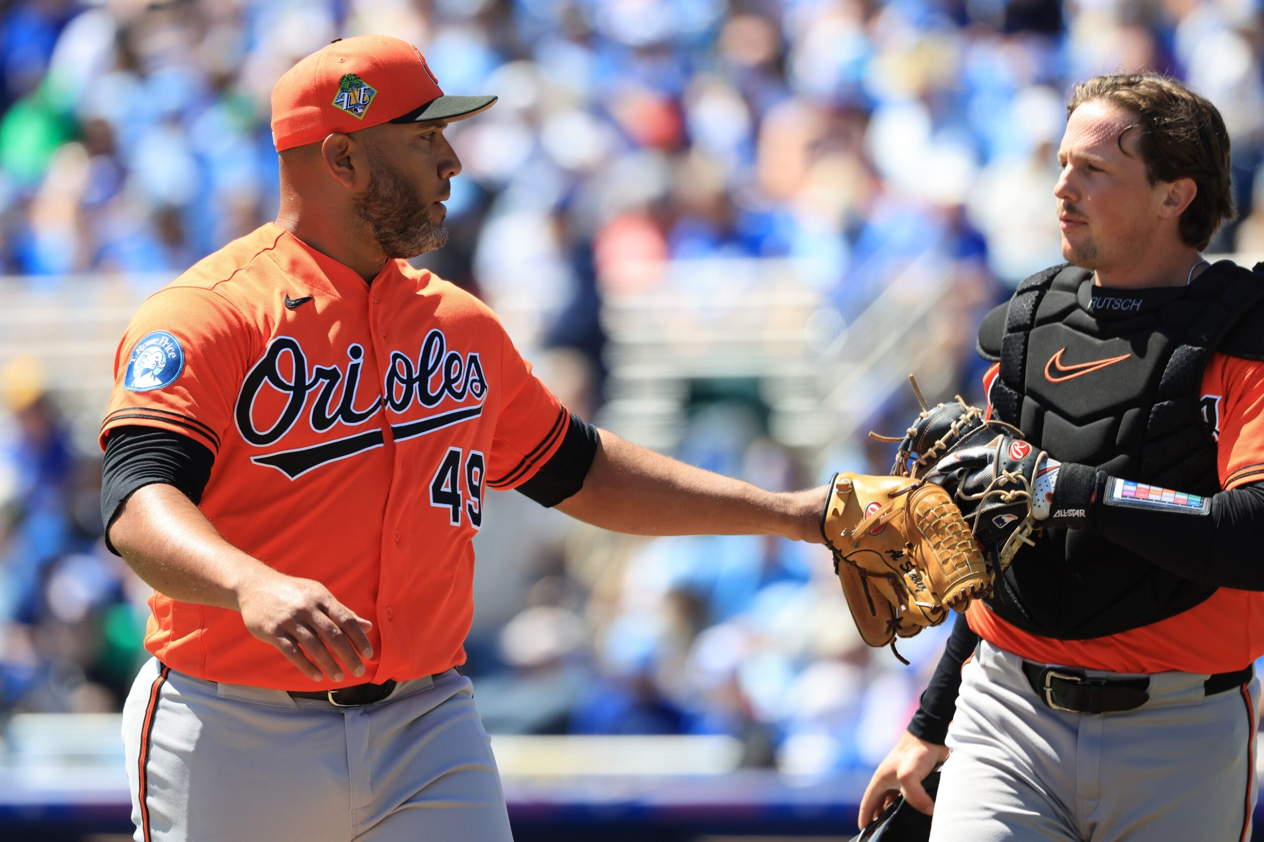 Mar 18, 2026; Dunedin, Florida, USA; Baltimore Orioles starting pitcher Albert Suarez (49) talks with catcher Adley Rutschman (35) at the end of the first inning against the Toronto Blue Jays at TD Ballpark. Mandatory Credit: Kim Klement Neitzel-Imagn Images