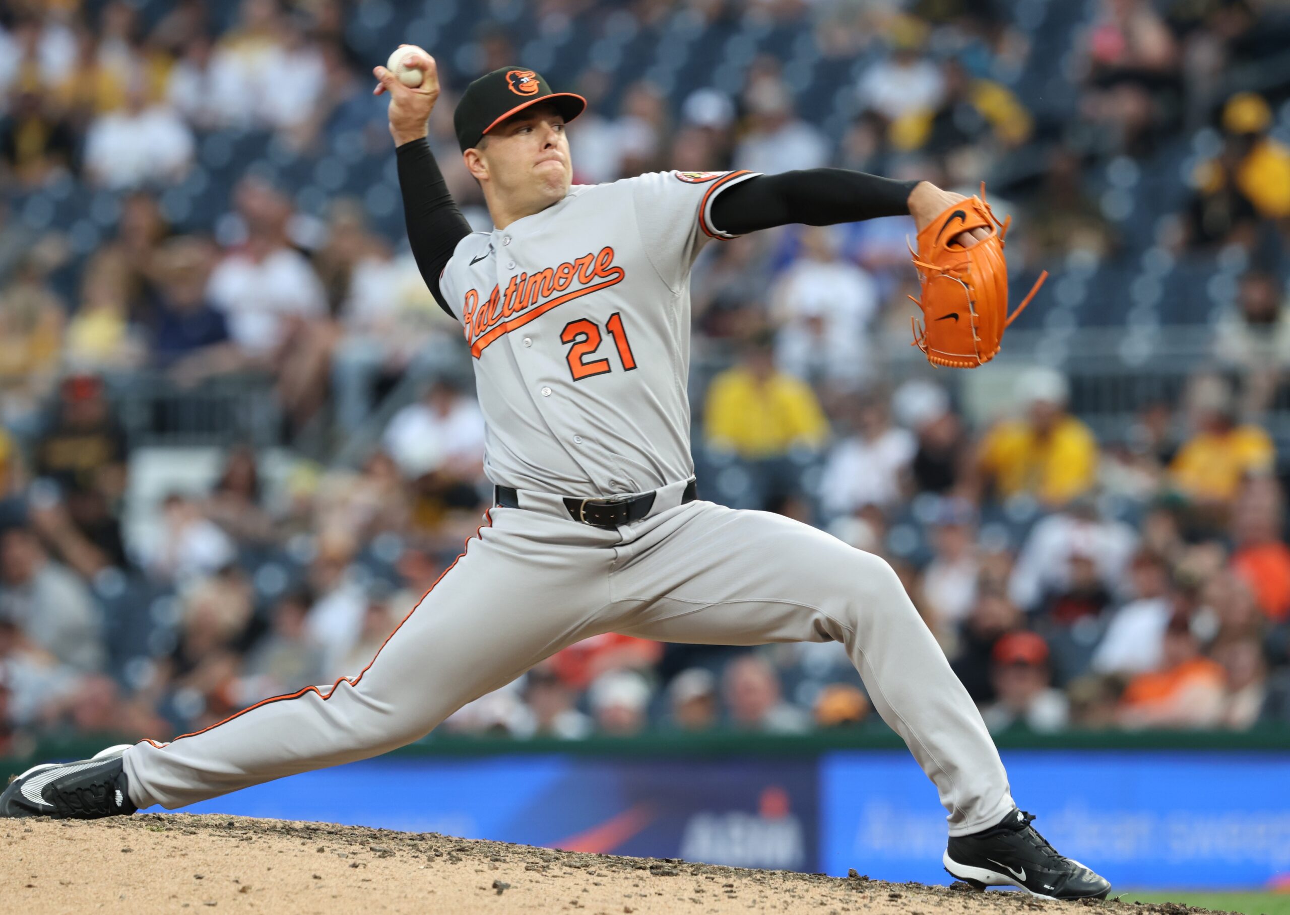 Apr 4, 2026; Pittsburgh, Pennsylvania, USA; Baltimore Orioles relief pitcher Ryan Helsley (21) pitches against the Pittsburgh Pirates during the ninth inning at PNC Park. Mandatory Credit: Charles LeClaire-Imagn Images