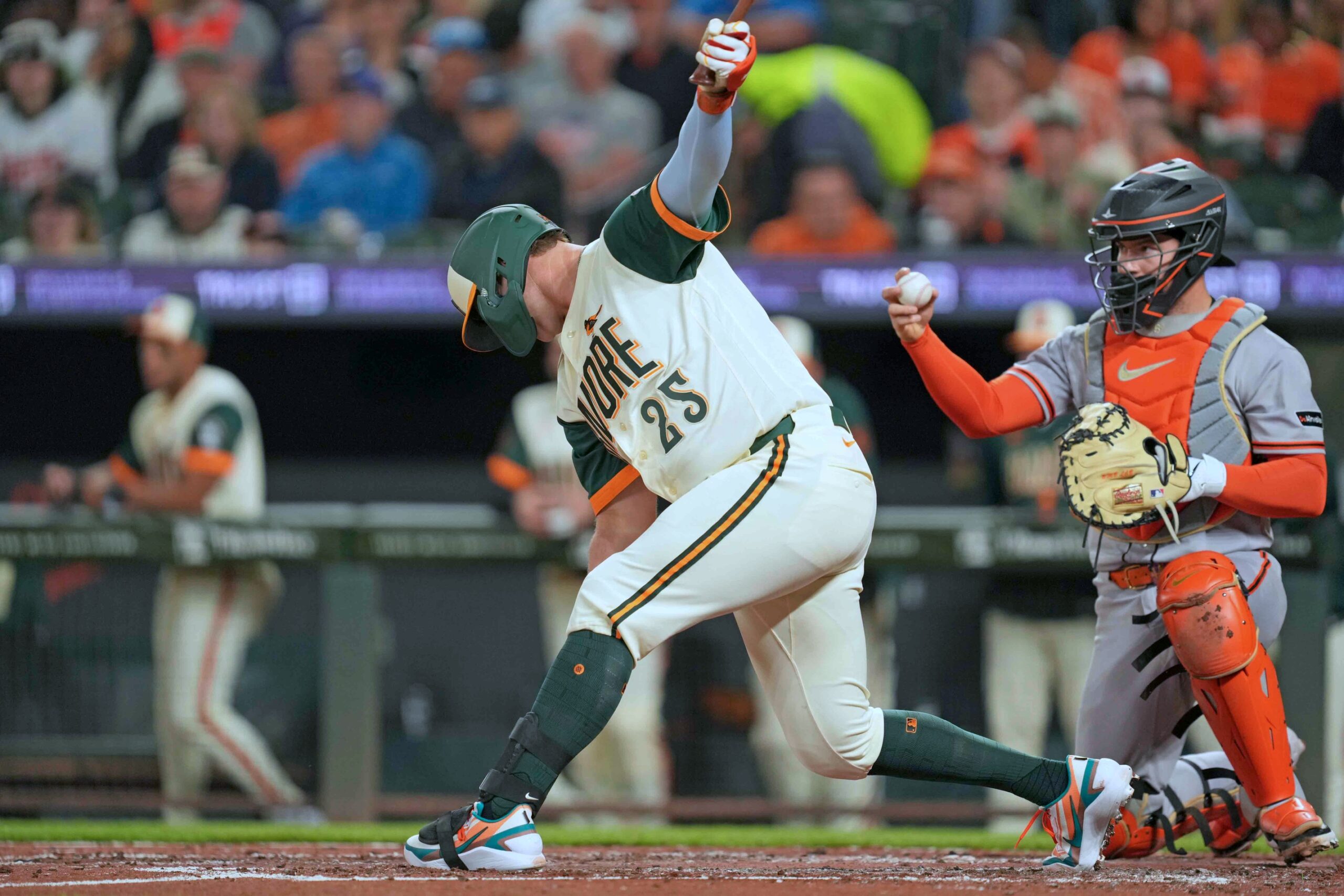 Apr 10, 2026; Baltimore, Maryland, USA; Baltimore Orioles first baseman Pete Alonso (25) strikes out with two runners in scoring position to end the third inning against the San Francisco Giants at Oriole Park at Camden Yards. Mandatory Credit: Mitch Stringer-Imagn Images