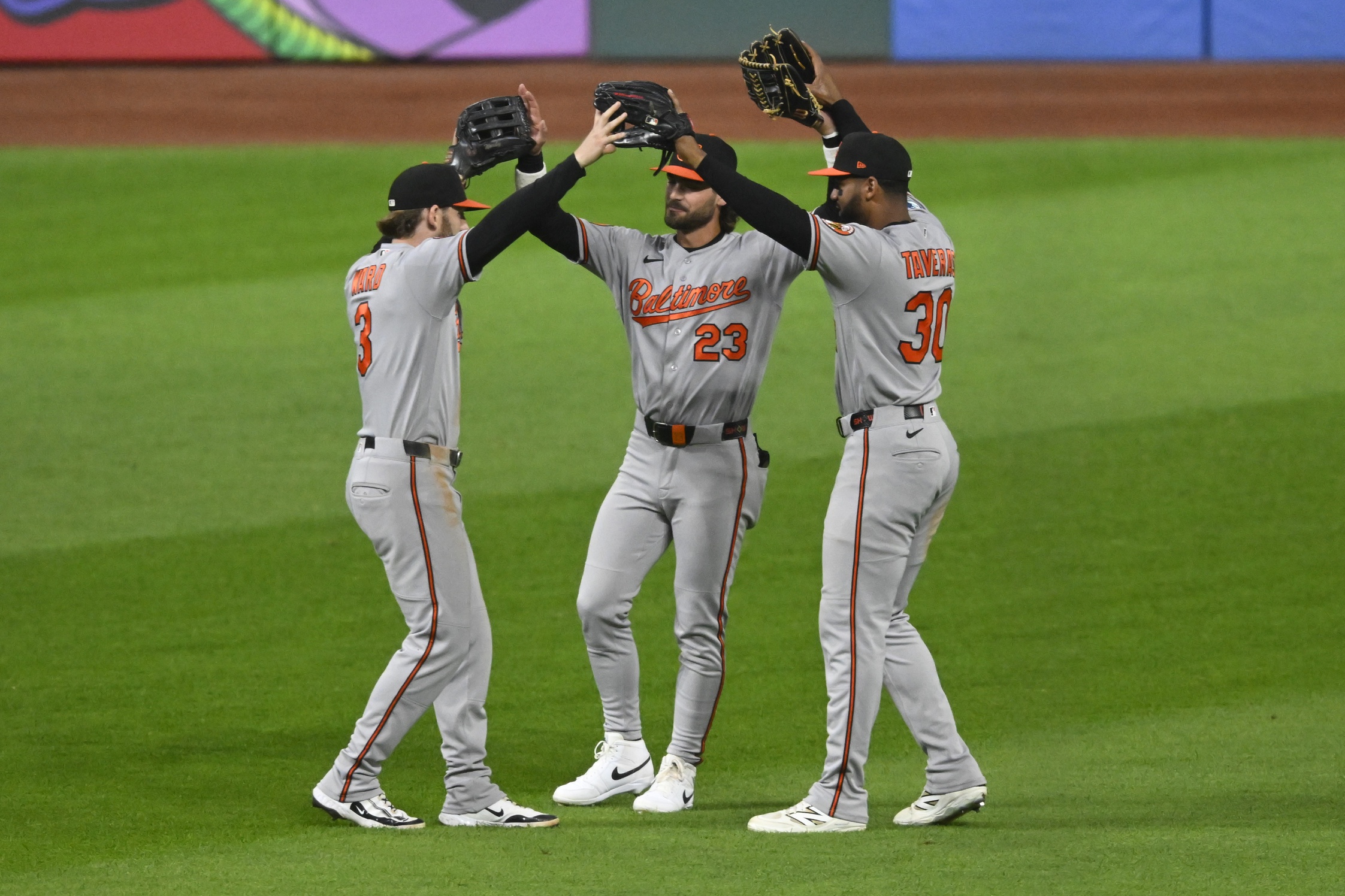 Apr 17, 2026; Cleveland, Ohio, USA; Baltimore Orioles outfielders Taylor Ward (3), Blaze Alexander (23), and Lady Taveras (30) celebrate a win over the Cleveland Guardians at Progressive Field. Mandatory Credit: David Richard-Imagn Images