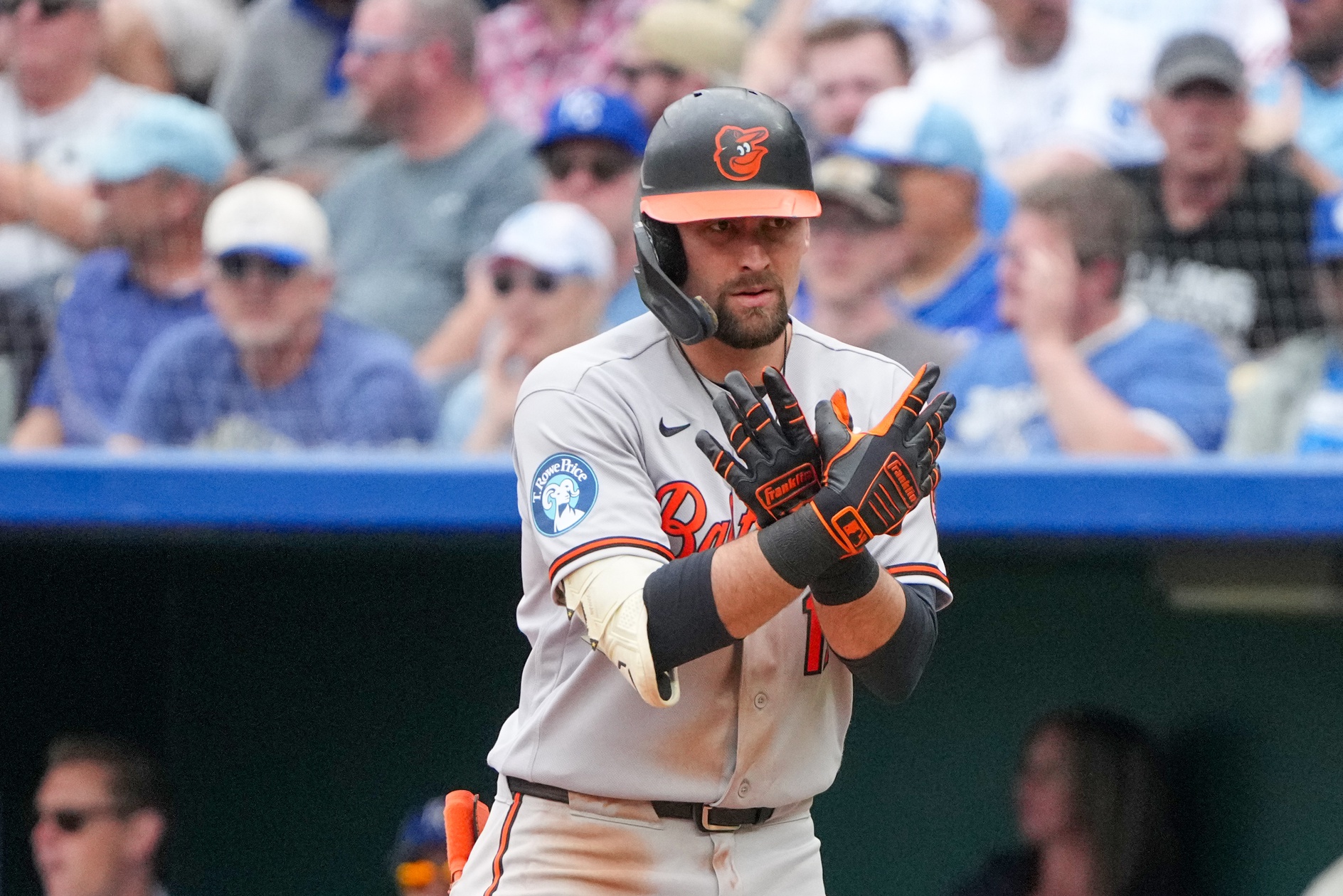 Apr 22, 2026; Kansas City, Missouri, USA; Baltimore Orioles left fielder Colton Cowser (17) celebrates after hitting a single against the Kansas City Royals during the sixth inning at Kauffman Stadium. Mandatory Credit: Denny Medley-Imagn Images